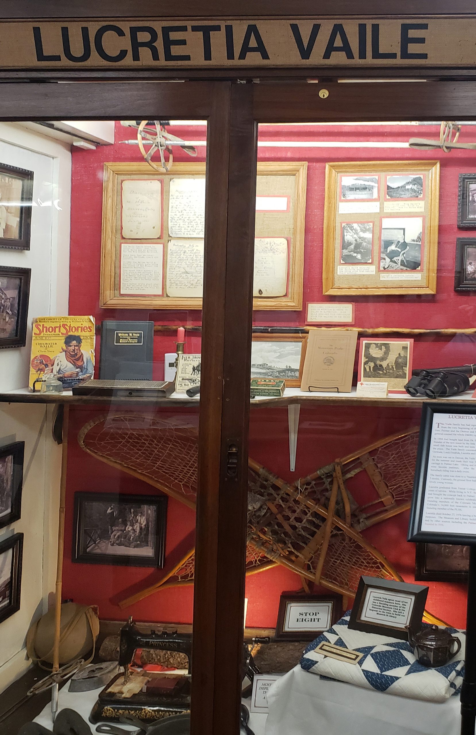 The building was erected as a memorial to Lucretia Vaile, who left a bequest to the town of Palmer Lake, which was used to build the original structure. With the new building came new museum pieces. A local furrier who was going out of business donated the glass display cases still used in the museum.