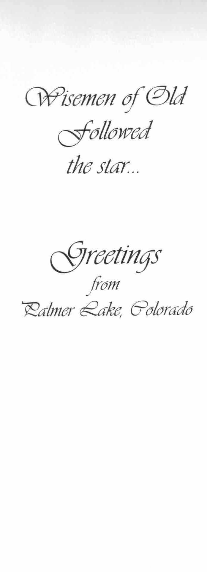 Printed text reads “Wisemen of old followed the star…Greetings from Palmer Lake, Colorado” on the inside. Pack of 10 folded cards measuring 9 ¼ x 3 ¾ with white envelopes.